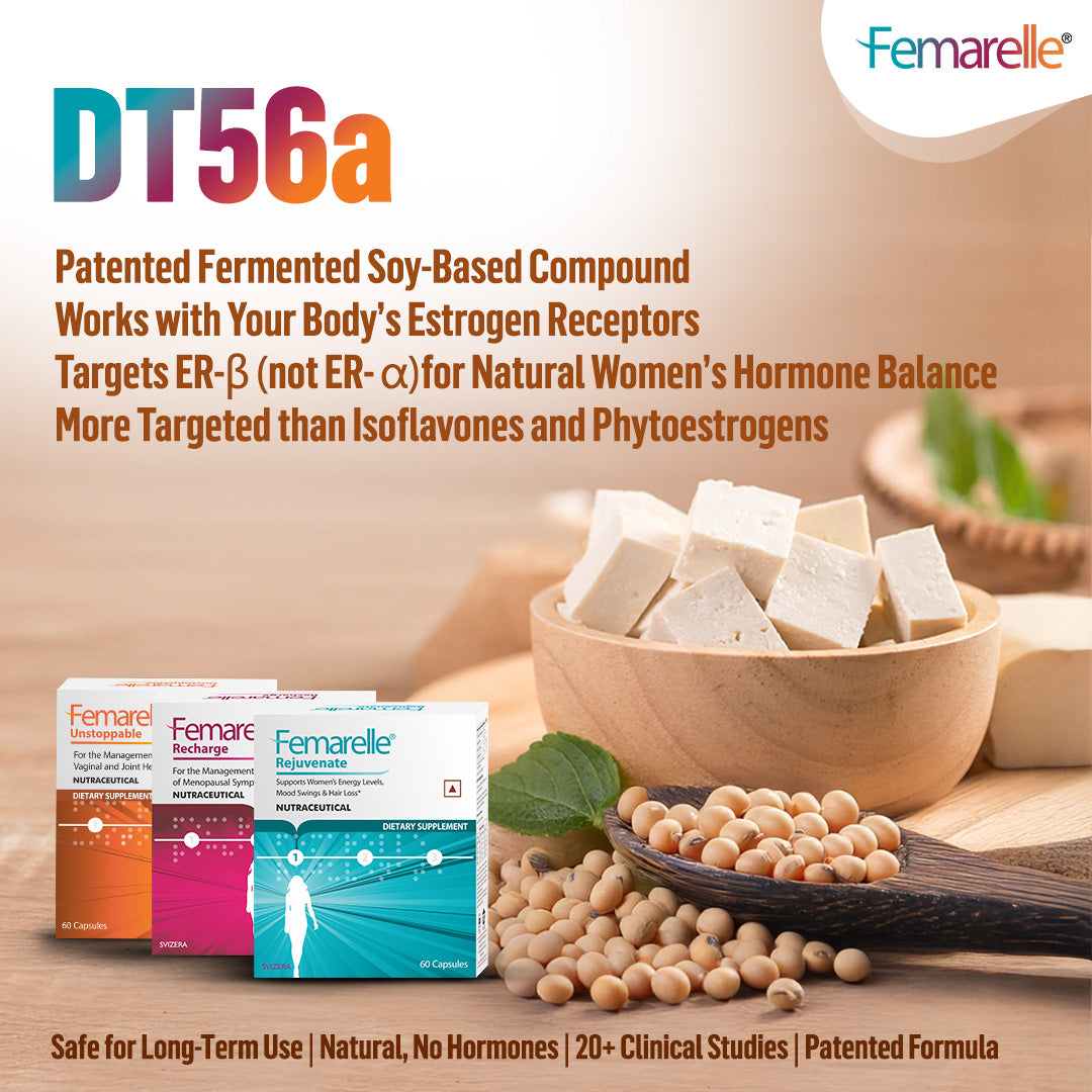 Femarelle® is a unique supplement with DT56a, a soy-based compound validated by extensive scientific research for risk-free relief.