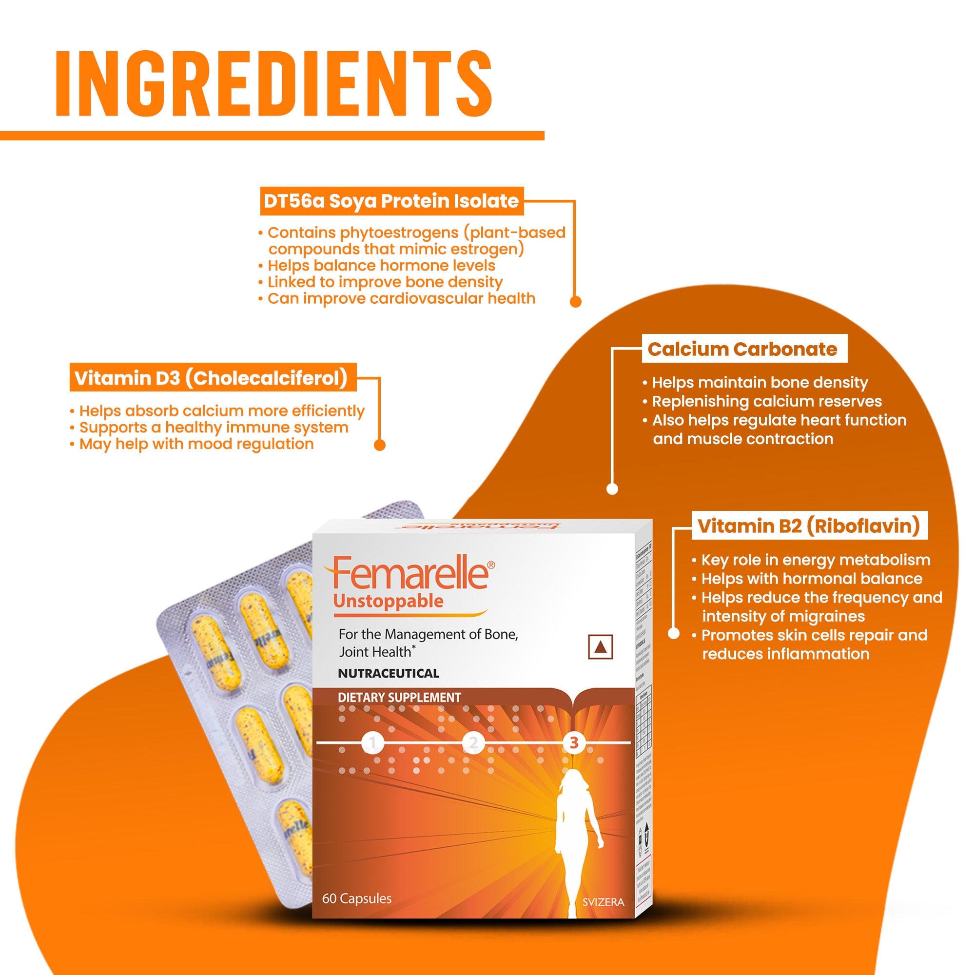2. Enhances Joint & Muscle Health: Femarelle® Unstoppable supports joint and muscle function reducing discomfort and promoting mobility.