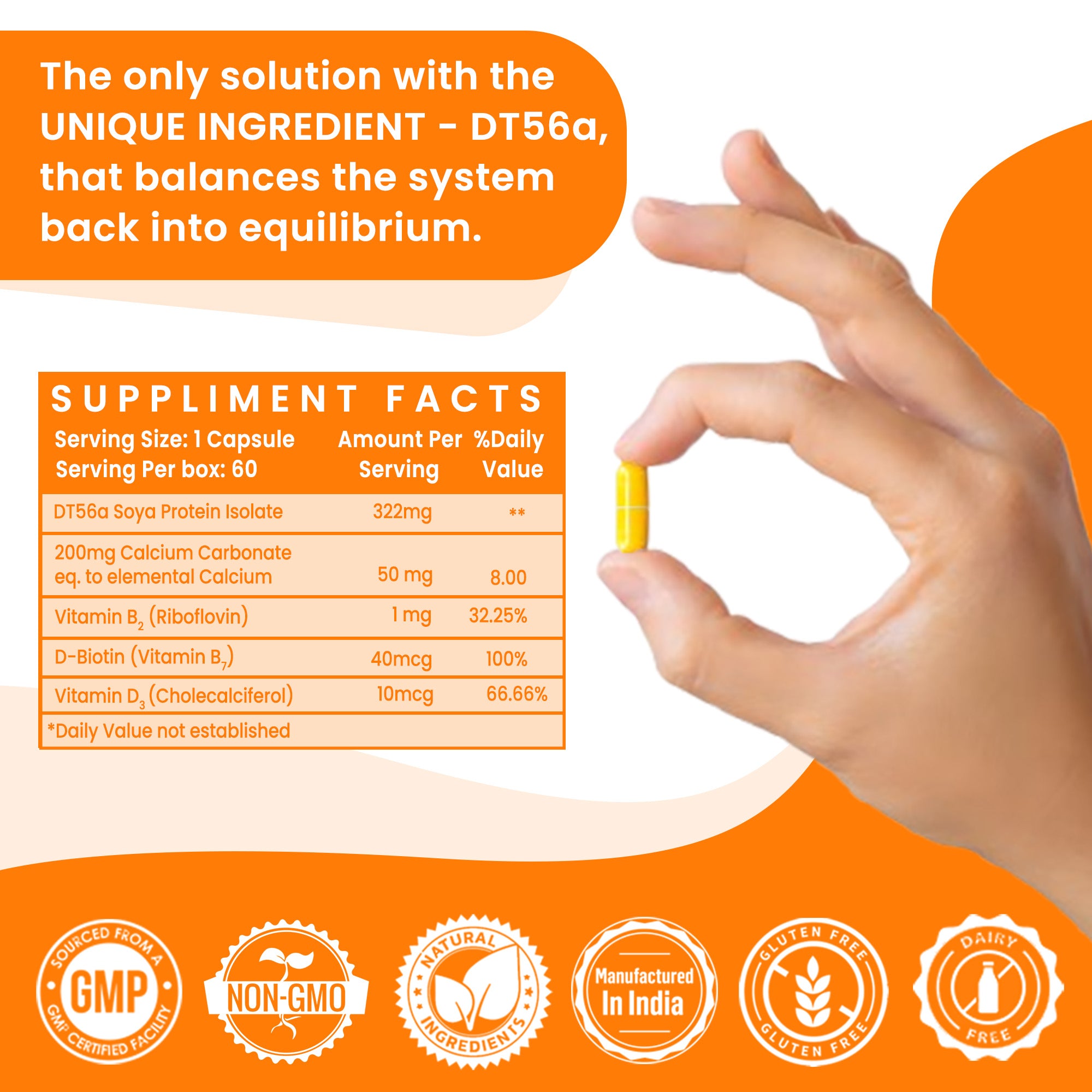 DT56a is a patented compound ensuring consistent absorption in the body unlike non-standardized isoflavones or variable herbal extracts.