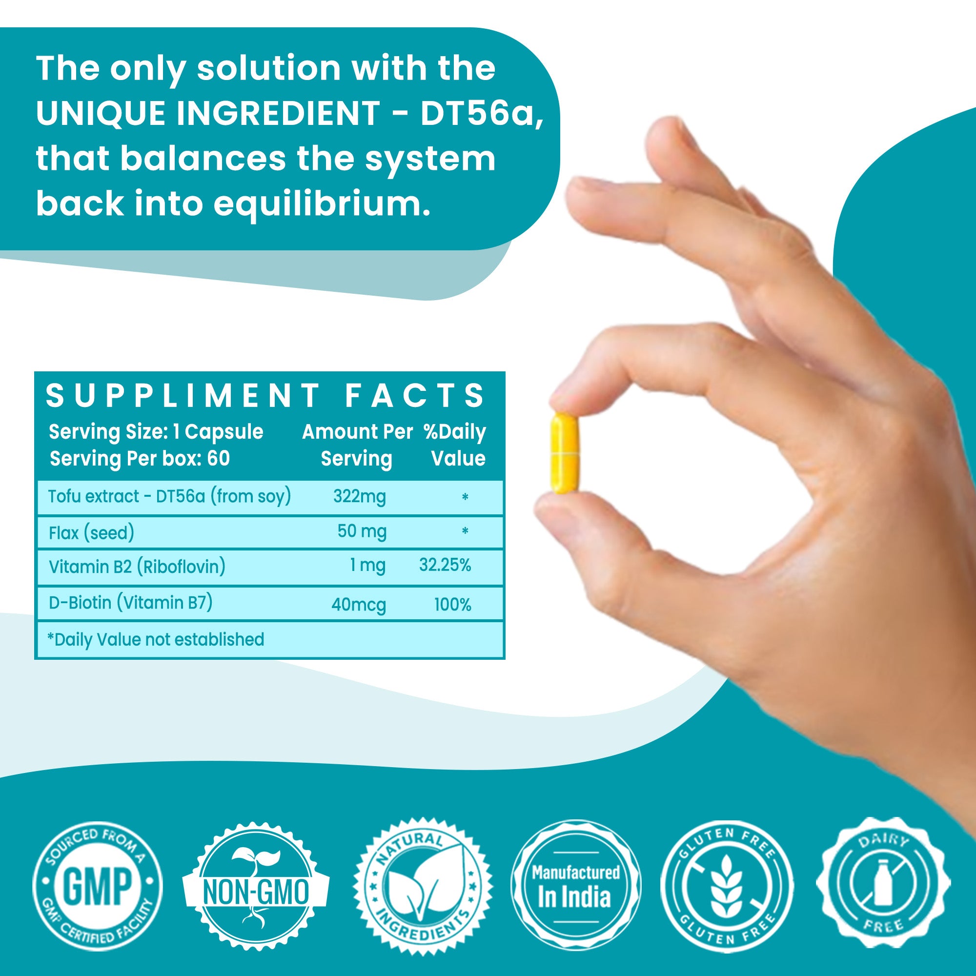 DT56a is a patented compound ensuring consistent absorption in the body unlike non-standardized isoflavones or variable herbal extracts.