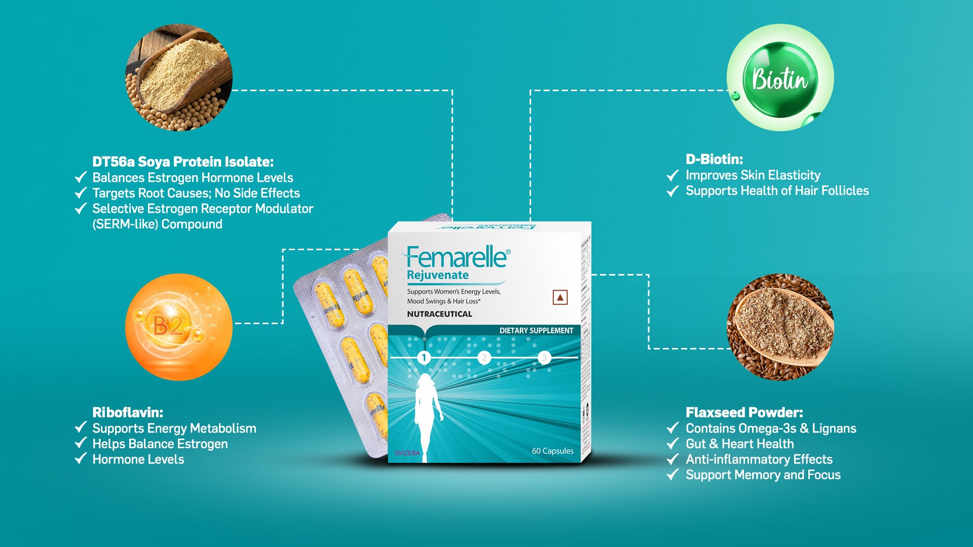 3. Stabilize Mood Swings for Emotional Balance: Femarelle® Rejuvenate includes vitamin B7 (biotin) to support your nervous system and psychological well-being.