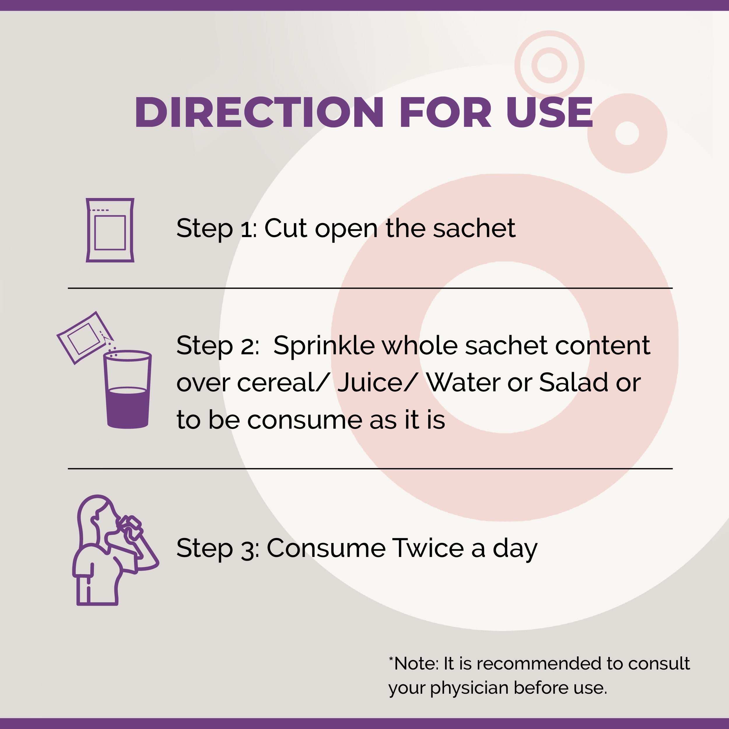 • Twice per day; sprinkle one whole sachet contents over food / beverage or to be consumed as it is.
